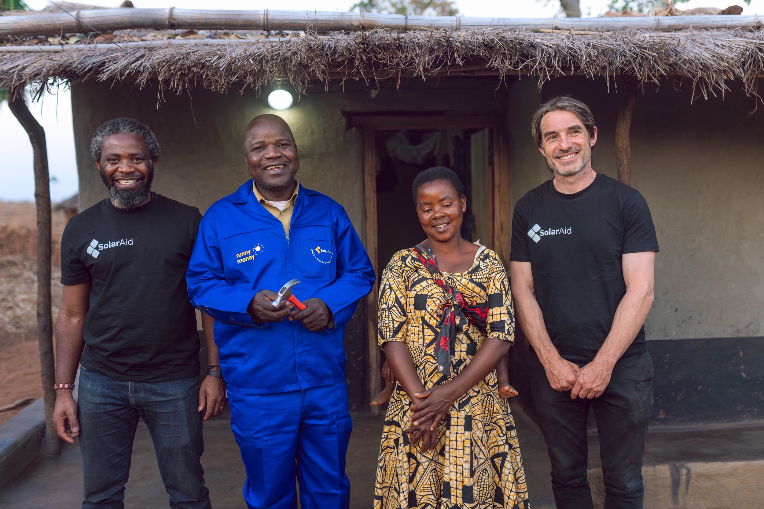 Charity Moyo Buleya’s household marked a reach of 100% access to solar light in T/A Kasakula. From left: Brave Mhonie, General Manager, SolarAid Malawi; Chief Kasakula; Charity Moyo Buleya; John Keane, CEO, SolarAid. Photo: SolarAid/Kondwani Jere.